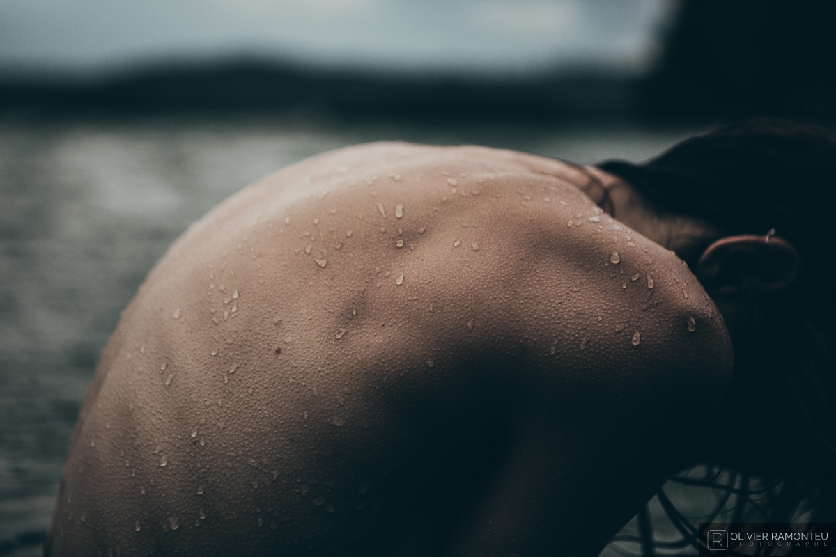 Là encore, j’ai commencé par quelques photos préparatoires, focalisées sur son visage. On l’y voit de face et de profil. J’ai ensuite orienté la séance vers les images que j’avais en tête et qui constituaient mon projet principal. Le point de vue change. Je la photographie le dos tourné vers moi, le buste en direction du vent violent qui s’abat sur nous. Il pleut, les conditions de prises de vue sont difficiles. Je lui donne quelques indications sur le type de mouvements que j’attends d’elle. Elle s’exécute avec application. Mon attention se concentre sur sa colonne vertébrale, sur sa peau qui se tend sous le froid et sur ses bras qui se nouent. Toute la tension que j’espérais est là. Son corps répond parfaitement à la violence des éléments. L’intérieur et l’extérieur à l’unisson. L’électricité est partout. Elle est palpable. Le résultat est à parfait à mes yeux.